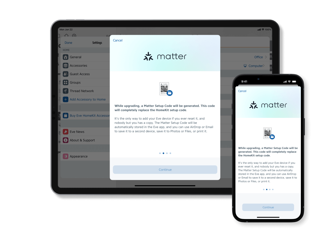 While upgrading, a Matter Setup Code will be generated. This code will completely replace the HomeKit setup code. It's the only way to add your Eve device if you ever reset it, and nobody but you has a copy. The Matter Setup Code will be automatically stored in the Eve app, and you can use AirDrop or Email to save it to a second device, save it to Photos or Files, or print it.